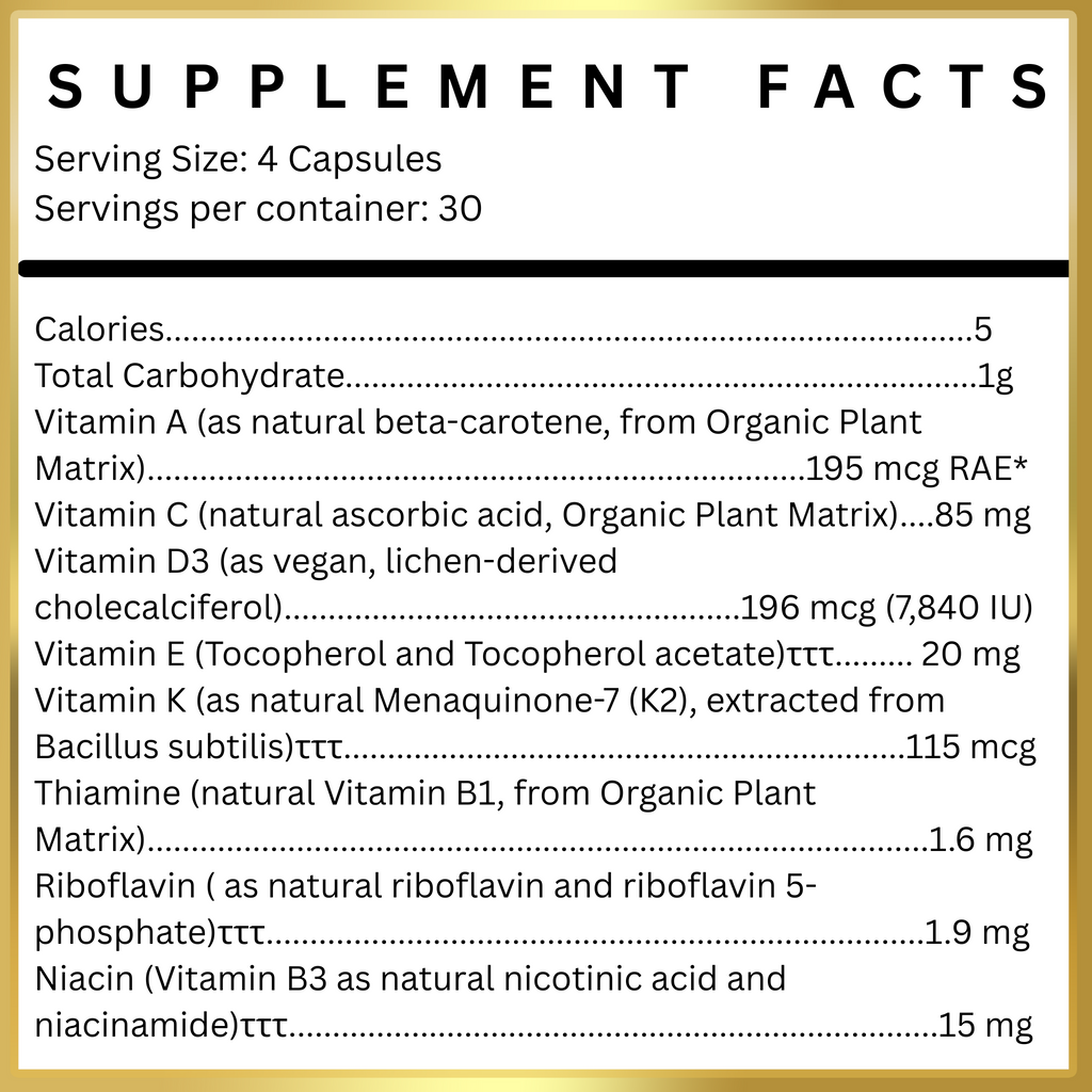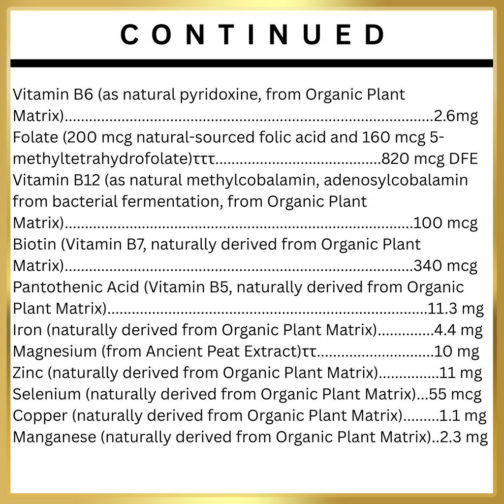 · full vitamin and mineral complex (vitamins a, c, d3 [vegan], e, k2-mk7, b-complex; iron; magnesium [from ancient peat extract]; zinc; selenium; copper; manganese; chromium; molybdenum)