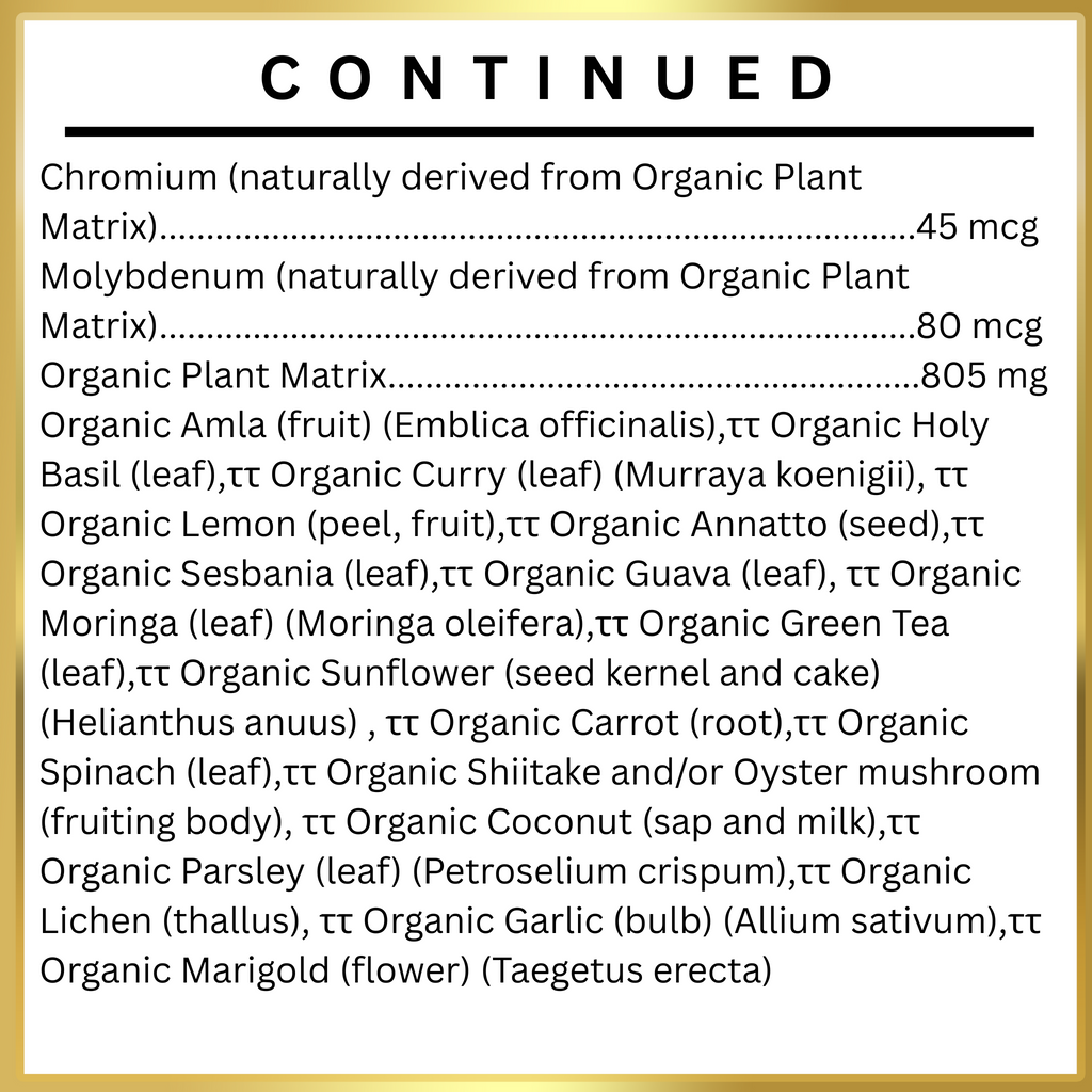 · organic plant matrix (805 mg): amla; holy basil; curry leaf; lemon (peel, fruit); annatto seed; sesbania leaf; guava leaf; moringa leaf; green tea leaf; sunflower (seed kernel and cake); carrot root; spinach leaf; shiitake and/or oyster mushroom (fruiting body); coconut (sap and milk); parsley leaf; lichen (thallus); garlic bulb; marigold flower